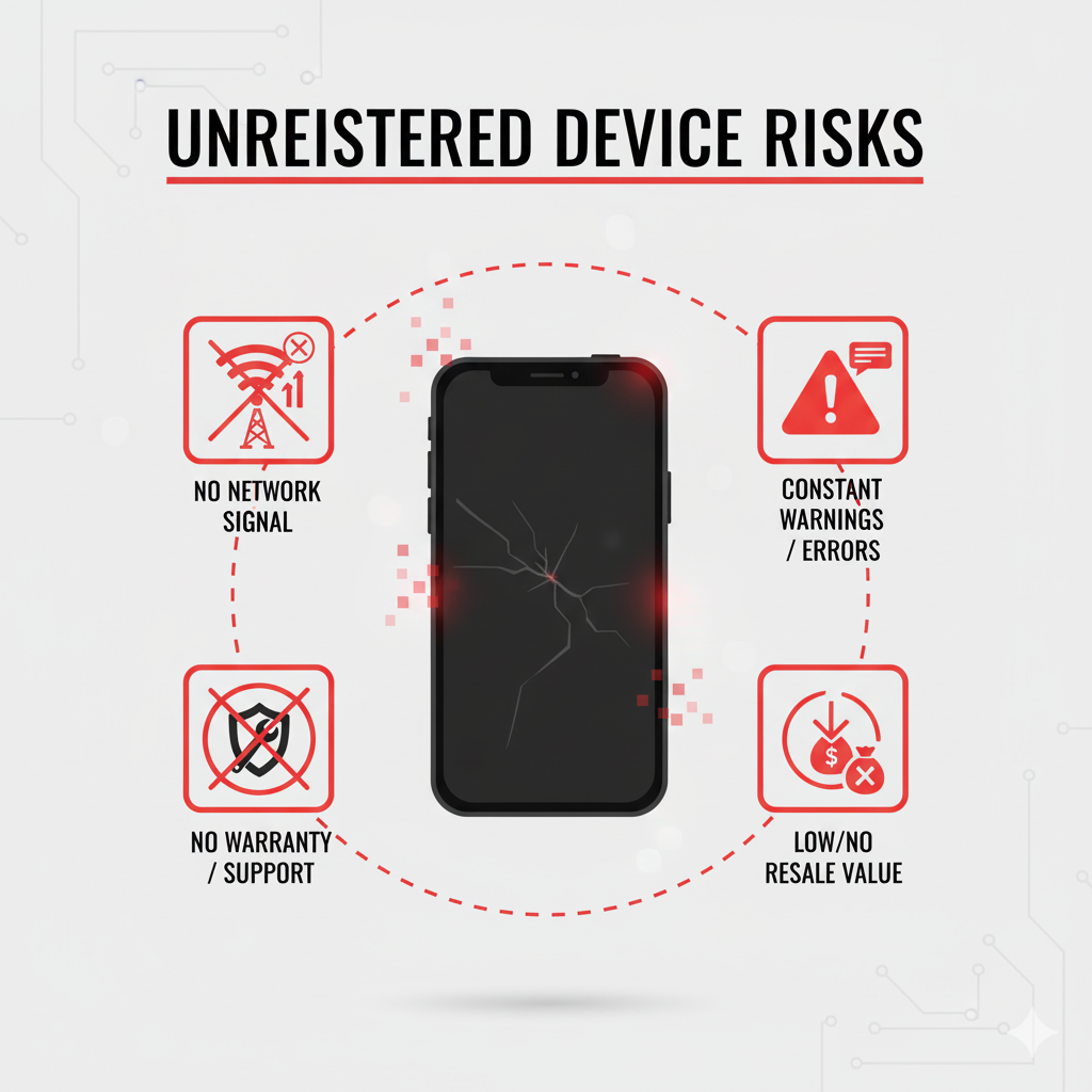 گوشی رجیستر نشده ممکن است در ابتدا کار کند، اما پس از مدتی اپراتور از طریق قطع آنتن یا ارسال پیامک هشدار فعالیت آن را محدود میکند. بنابراین استفاده طولانیمدت تضمین شده نیست و ریسک مشکلات قانونی و قطع سرویس وجود دارد.